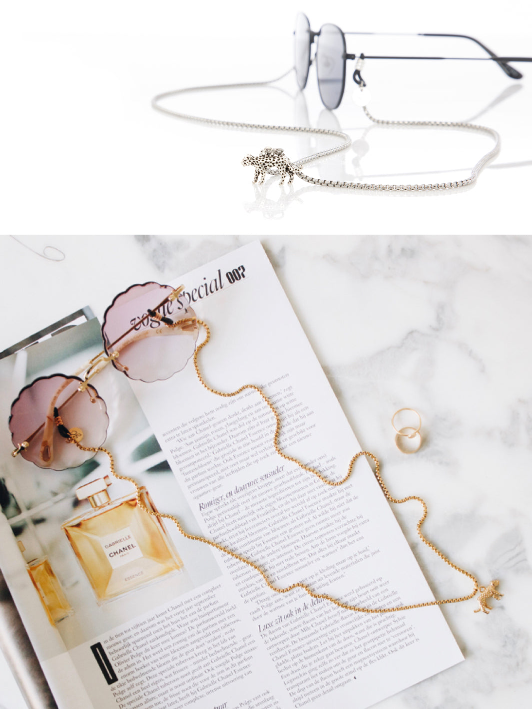 These sunglasses chains are a real eye-catcher, because of the jaguar charm. Available in gold, silver or rosé gold and not only real handy but also fashionable and stylish. Add an extra jewel to your jewellery collection and shine like you never shined before!